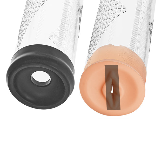 Mit einem Kolben von circa 20 auf 6 Zentimetern habt Ihr genug Volumen, damit Ihr nicht direkt irgendwo unangenehm anstoßt. Der Kolben ist glasklar für beste Sicht auf das Ergebnis. Apropos Sicht: für Freunde des optischen Reizes ist ein optinaler Sleeve in Vagina-Style mit dabei.